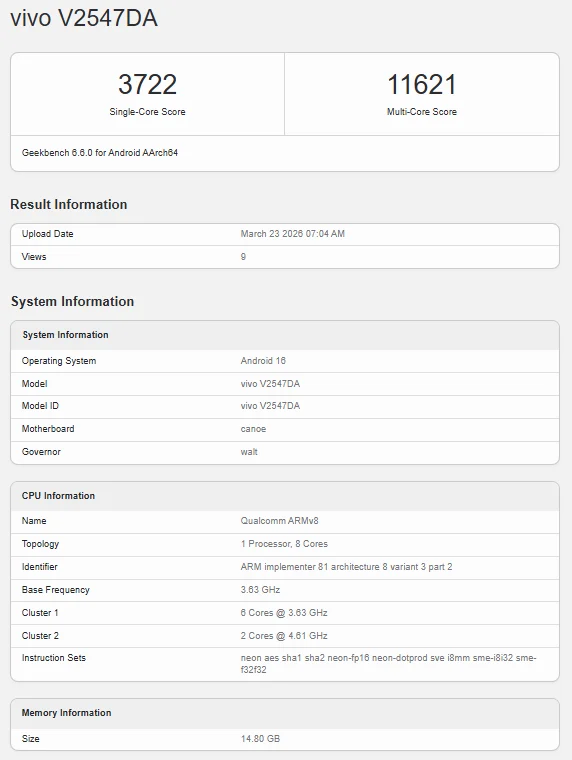 O modelo identificado como V2547DA, que deverá corresponder à versão com comunicação via satélite, apareceu no Geekbench com resultados bastante sólidos. Foram registados 3722 pontos em single-core e 11621 em multi-core, valores que encaixam perfeitamente no que se espera de um flagship Android atual.